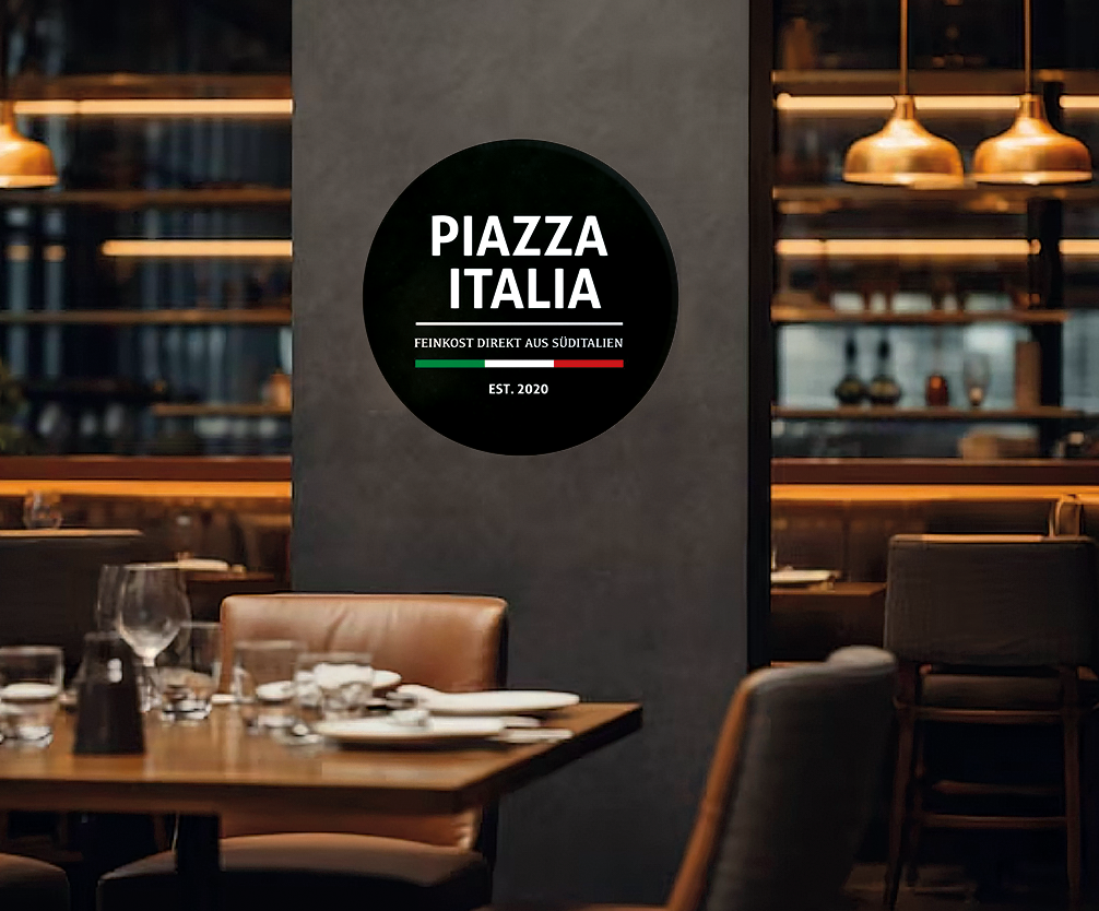 Für ein mögliches, modernes Feinkost-Restaurant habe ich das Logo Piazza Italia gestaltet – ein Symbol für italienische Lebensfreude und kulinarischen Hochgenuss. Das Design besteht aus einem schlichten schwarzen Kreis mit weißer Typografie und edlen Akzenten, die zeitlose Eleganz und Raffinesse ausstrahlen.