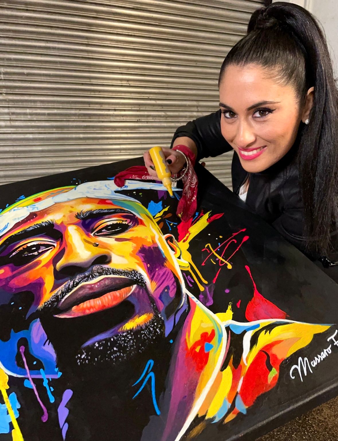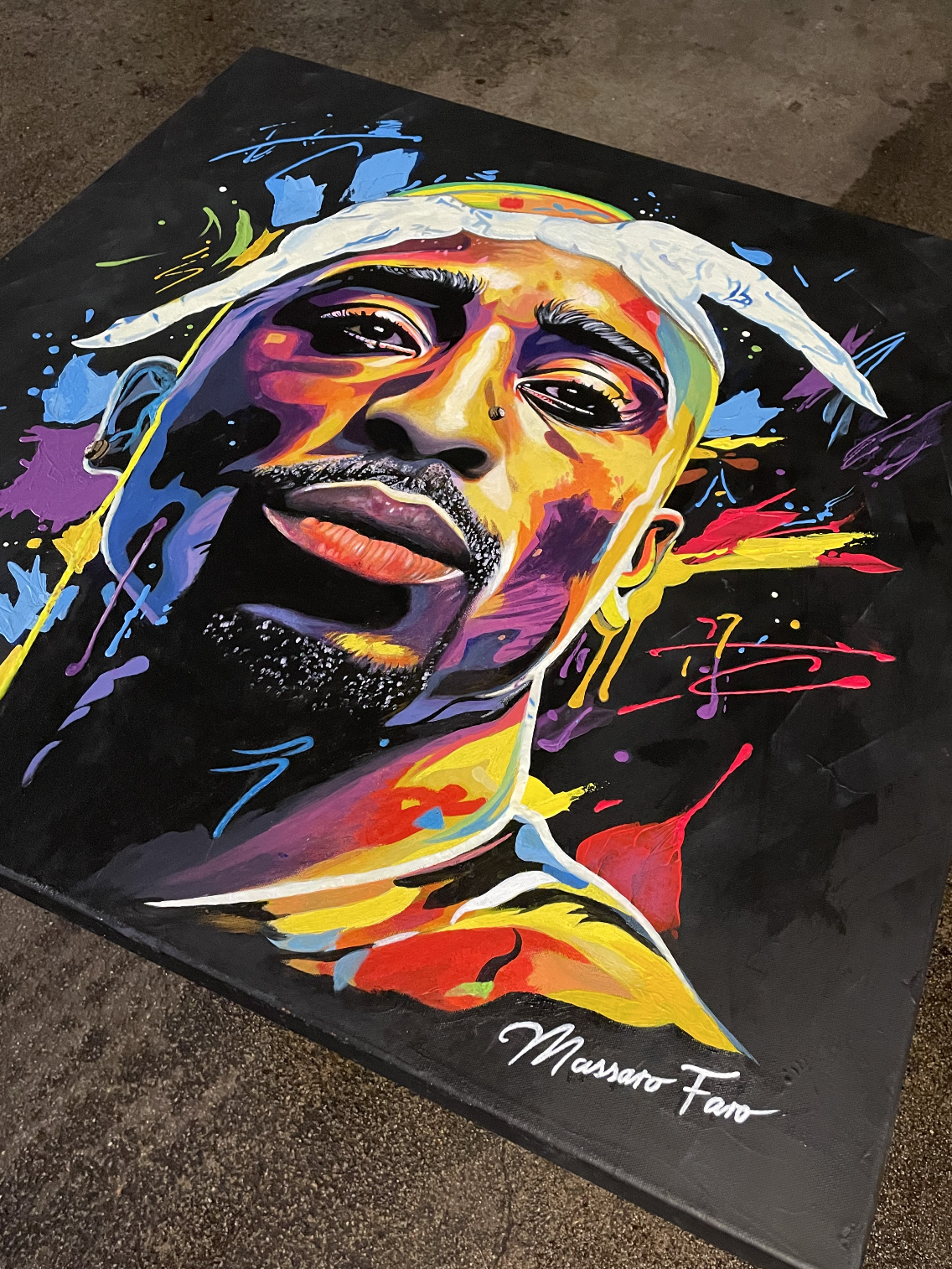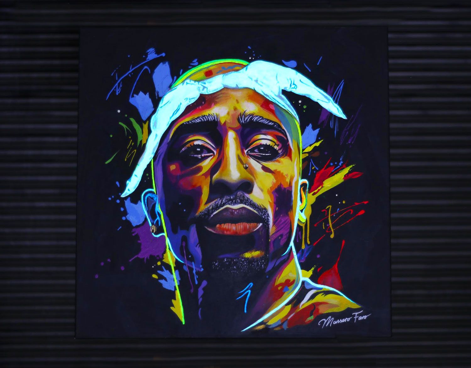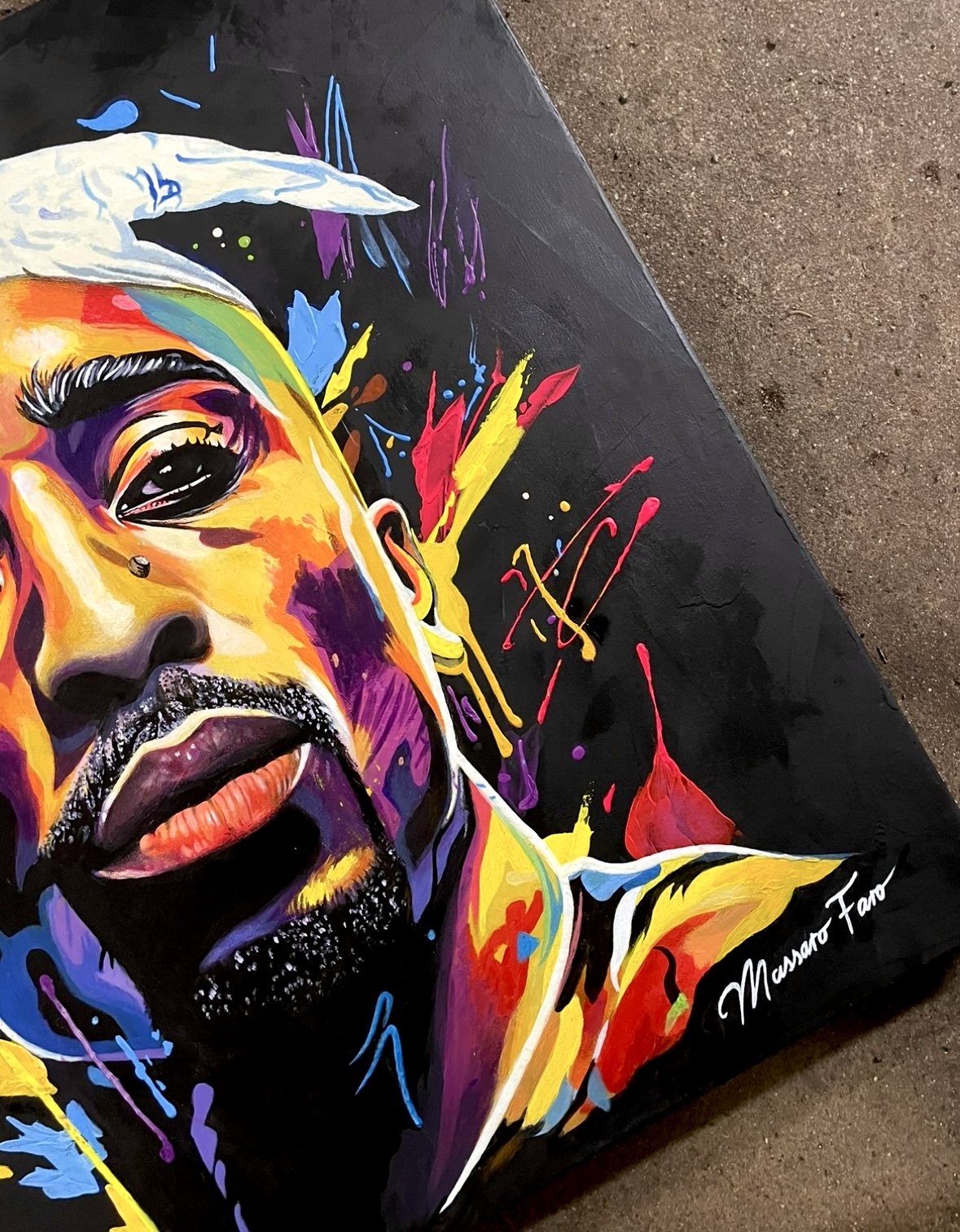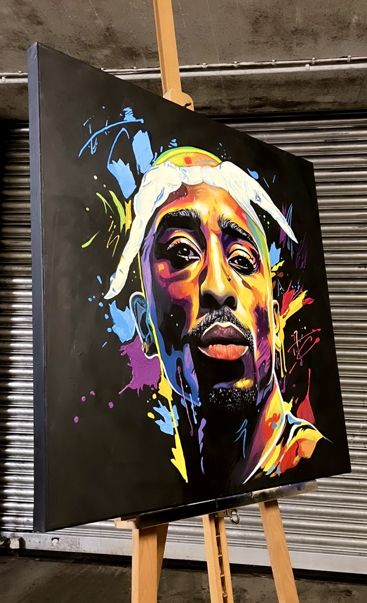 Dieses Bild ist eine Hommage an 2Pac (Tupac Shakur), den einflussreichen Rapper und Künstler, der die Hip-Hop-Welt nachhaltig prägte. Es spiegelt meine künstlerische Entwicklung wider und nutzt lebendige Farben auf schwarzem Grund, um 2Pacs revolutionären Geist und seine inspirierende Wirkung zu symbolisieren.
